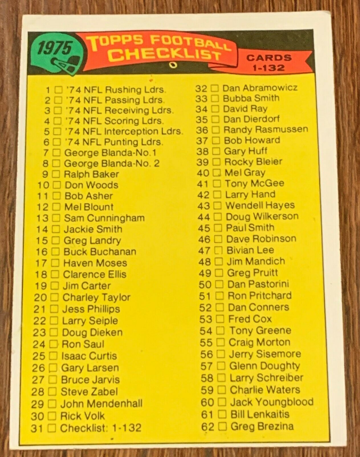 1975 Topps Football #31 Checklist for cards 1 through 132
